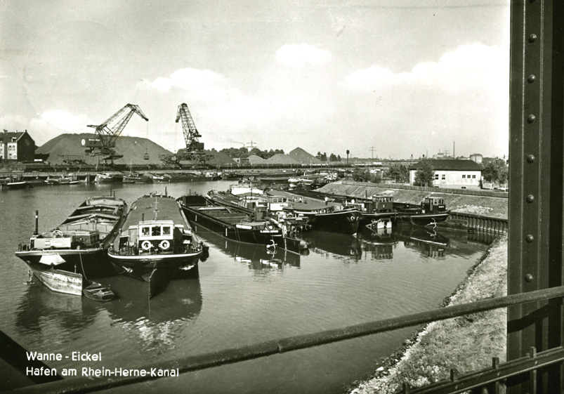 Das waren noch Zeiten, als die Kähne in Siebenerreihen im Westhafen andockten. Zum Zeitpunkt dieser Aufnahme (evtl. schon Mitte der 1950er Jahre) war von Kohlekrise wohl noch wenig zu spüren. Der Umschlag brummte und Wanne-Eickel galt