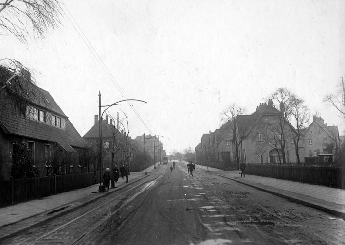 Dieses Bild zeigt die Hordeler Straße in Eickel mit Häusern der Krupp-Kolonie Mitte der 1920er Jahre. Die Elektrische fuhr damals noch einspurig mit Ausweichstellen für den Wagen in Gegenrichtung. Es