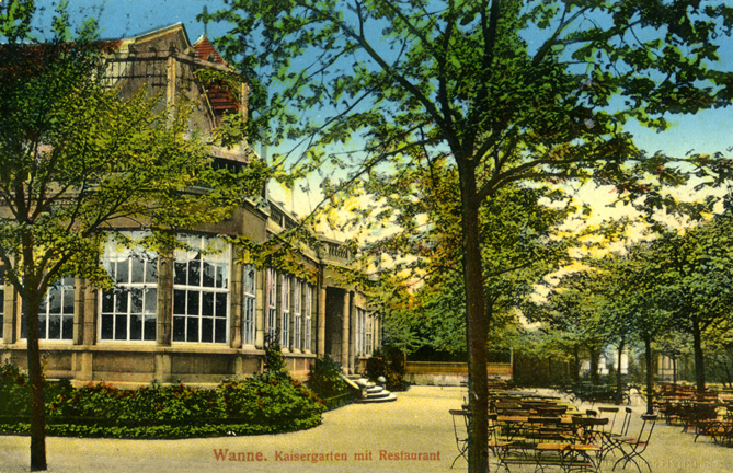 Die Wanne Eickeler hatten sich einen feinen Park geleistet und schon bald die Holzgaststätte durch einen ebenso feinen Kaisersaal mit Restaurant und Biergarten ersetzt. Zwei Jahre nach dieser Aufnahme dankte WIlhelm II ab, und die Wanne-Eickeler standen blöd da mit ihrem Kaisergarten. Also wurde er in “Stadtgarten “ umgetauft und den Bau nannte man fürderhin “Stadtgartensaal” mit “Stadtgartenrestaurant”.