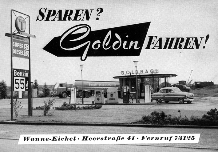 1956 eröffnete der Kohlenhändler Erhard Goldbach seine erste Tankstelle an der Heerstraße. Der dann folgende Aufstieg zum Wanne-Eickeler Ölkönig war rasant