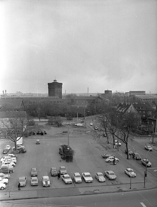 1975 fotografierte Walther Müller für die WAZ den Sankt-Jörgen-Platz in Eickel. Die Parkplatzsituation war damals deutlich entspannter. Die heutige Bebauung fehlt noch - aber den Markt gab es Mitte der 1970er schon seit vielen Jahren auf dem Platz. Im Hintergrund steht noch der markante Malakowturm der Zeche Hannover-Hannibal.