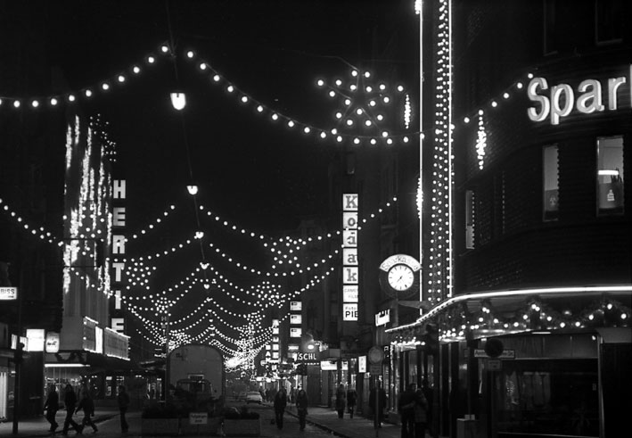 Weihnachten 1972: Die Hauptstraße im festlichen Lichterglanz, Blumenkübel versperren ein wenig die Durchfahrt, schließlich ist die Hauptstraße seit ein paar Wochen bereits Fußgängerzone. Was aber offensichtlich nicht alle Autofahrer