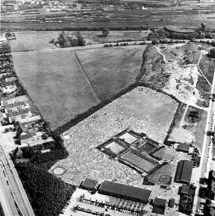 Diese Luftaufnahme des Freibads entstand vermutlich 1966, im Jahr seiner Eröffnung - und erzählt ein Stück Stadtgeschichte. Im oberen Bildbereich verlaufen die Bahnstrecke und die OW III, die heutige Berliner Straße. Rechts oben im Bild sieht man den alten Ringlockschuppen, von dort bis zum Freibadgelände erstreckte sich noch der Sandberg. Von der Scharpwinkel-Siedlung ist auf diesem Bild noch nichts zu ahnen, bis zur Bebauung an der Dorstener Straße (linker Bildrand) war hier 1969 eine große Ackerfläche.
