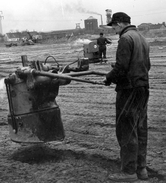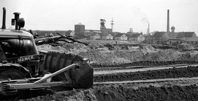 Dieses Bild zeigt eine Baustelle irgendwo in Unser Fritz. Im Hintergrund ist die Schachtanlage Unser Fritz 1/4 zu sehen.