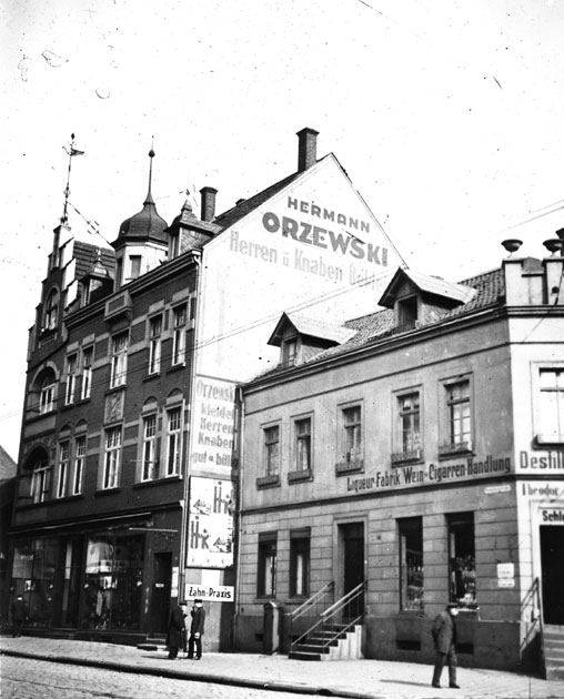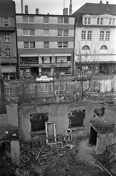 das Textilhaus Zerwes zu sehen, dort wo im Vordergrund die Ruine zu sehen ist, baute wenig später Woolworth.