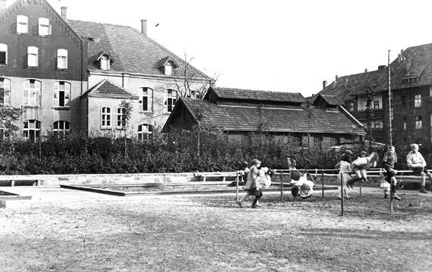 Wo spielten diese Kinder? H.W. Peters hat eine Antwort: Den Spielplatz gab es an der Alberstraße. Im Hintergrund ist die Goethe- und Schillerschule zu erkennen, die an der Hedwigstraße steht. Auch Daniela Stefanski hat diesen Spielplatz wiedererkannt. Uschi Plester kennt den Platz ebenfalls - schließlich hat sie dort oft mit ihrer Schwester gespielt.
