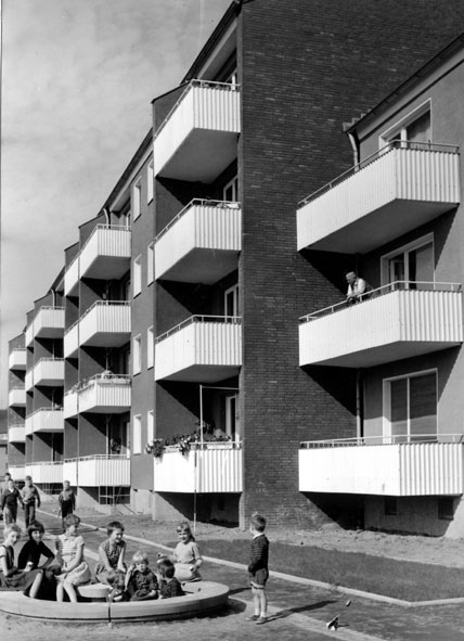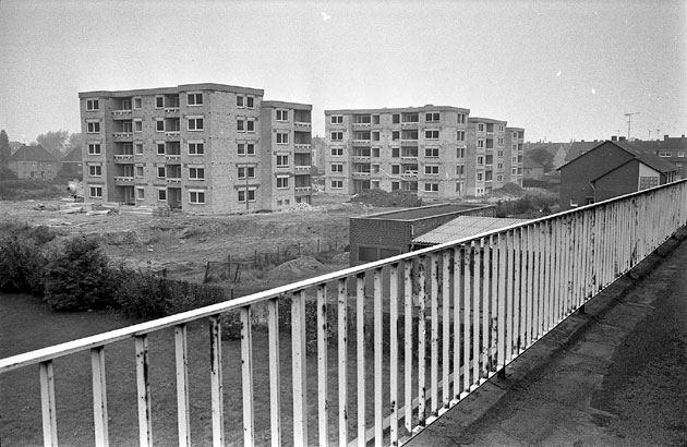 “Es handelt sich um Häuser der Stadt Wanne-Eickel. In Röhlinghausen wurde zwischen 1962 und 1965 eine ganze Siedlung für kinderreiche Familien und Aussiedlerfamilien gebaut. Das Bild zeigt den Hofbereich der Häuser 24 bis 30 und muss