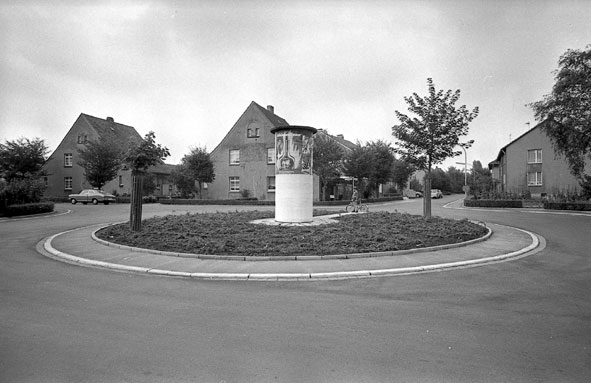 Der wahrscheinlich letzte Kreisverkehr im Wanne-Eickel der 1970er Jahre. Auf der Litfass-Säule Plakatwerbung von “Schlehen Feuer” und “Tri Top”.