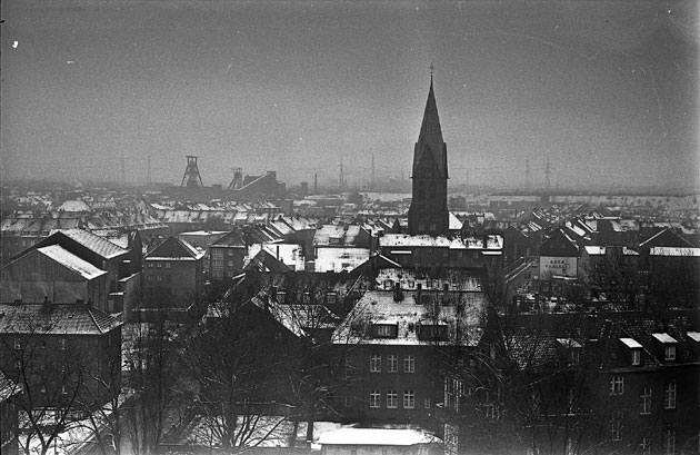Das untere Bild zeigt nach Westen. Unübersehbar die Laurentiuskirche, im Hintergrund die Zeche Pluto, Schacht Wilhelm. Vorne links sieht man die Hospitalstraße.