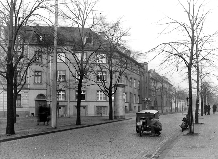 Dieses Bild stammt wahrscheinlich aus der Vorkriegszeit. Auf welcher Straße mag sich dieser Auslieferungsfahrer (motorisierte Post?) gerade um sein Fahrzeug kümmern?