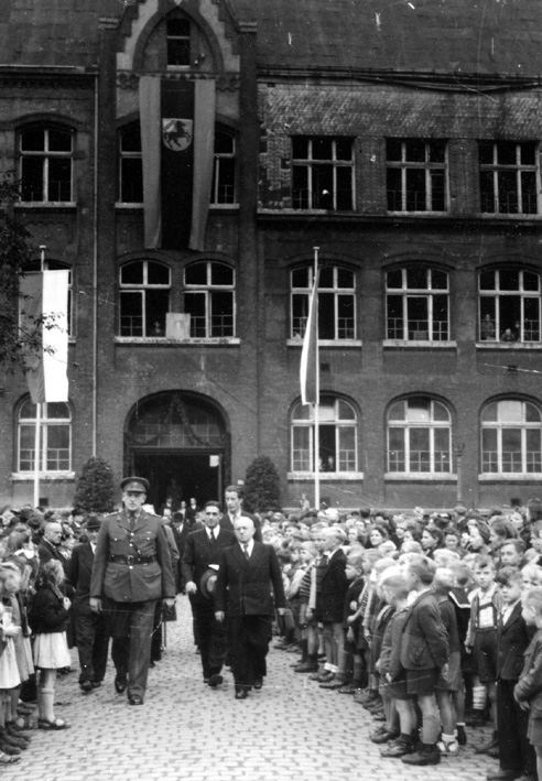 Schule nach dem Krieg wiedereröffnet. Aus diesem Grund fand ein großer Festakt statt. Das Bild zeigt den stellvertr. Stadtkommandanten Captain A. Cox ( in engl. Uniform) beim Verlassen des Gebäudes. Rechts neben ihm : Dolmetscher Karl