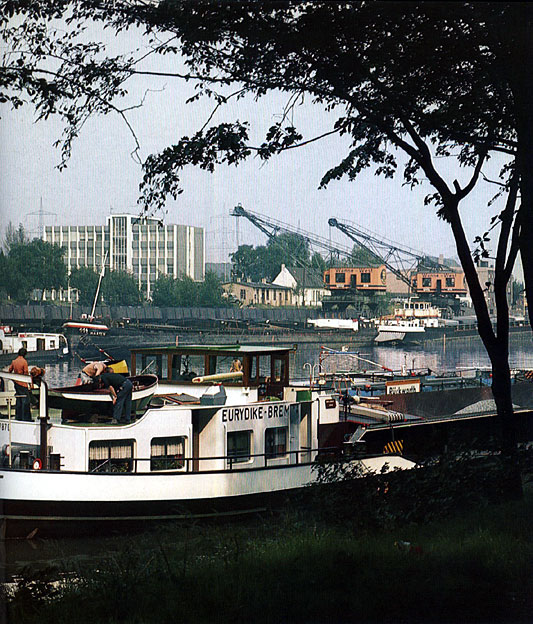 Blick vom südlichen Kanalufer auf den Westhafen. Im Hintergrund die Hafenverwaltung.