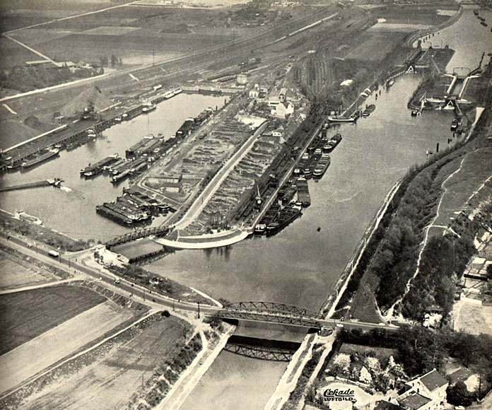 Schiffahrts-Kindergarten. Diese heute weitgehend in Vergessenheit geratene Einrichtung lag am Erweiterungsbecken des Westhafens (von der Recklinghauser Straße über die Hafenbrücke, dann unmittelbar links - auf dem dritten Bild von oben sind Erweiterungbecken, Hafenbrücke und Kindergarten zu erkennen). Herzlichen Dank für die Infos an Alfred Schaaf und Ernst Schumann!