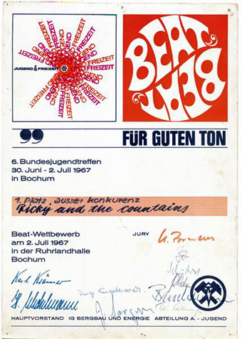 Bei den Beat-Wettbewerben gab es natürlich auch “amtliche” Urkunden für die Bestplatzierten. Das Dokumnt rechts wurde allerdings auf Ricky & The Countains ausgestellt. Diese Gruppe war die zweite Station in der Beat-Karriere Werner Meckelburgs.