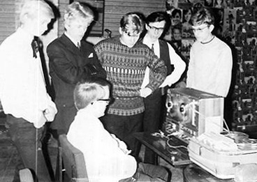 Die erste Besetzung von Rick & The Countains im beim Abhören von Live-Aufnahmen im “Hightech”-Tonstudio: (v.l.) Manfred Buurmann (Schlagzeug), Udo “Ricky” Heine (Gesang), Werner Meckelburg (Rhthmusgitarre), der leider schon verstorbene “phil” Filipiak (Sologitarre) und Willi Useding (Bass). Sitzend: Udo Heines Bruder, der die Live-Aufnahme gemacht hatte.