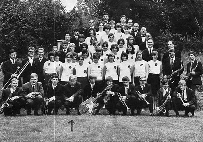 August 1967: Die Nightbirds mit der Jungen Chorgemeinschaft auf Finnland-Tournee. Vordere Reihe u.a.: Werner Meckelburg (Pfeil), rechts daneben Hannes MĂĽller und die Trompeter Harald Bonsack und Uwe Marschall