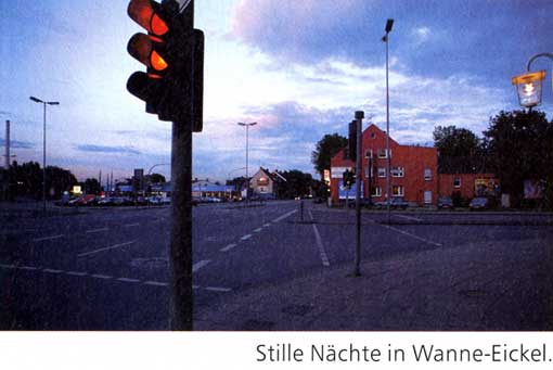 Unter der Sonntagssonne liegt Wanne-Eickel brütend und leer, als wäre der basaltgepflasterte Stadtteil von einer ungeheuren Faust in die Magengrube getroffen worden. Nichts, kein Liebeskummer, kein Gefängnis, kann so verzweifelt sein wie eine sonnige Fußgängerzone mit toten Geschäften und toten Schaufenstern. Lebendig sind hier nur die paar wenigen Mütter mit Kinderwagen.