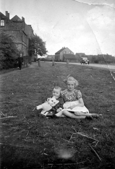 Kinder an der Hüller Straße in den 1930er Jahren. Die Häuser hinten rechts sind im Krieg zerstört worden. Heute steht hier der Sonnenschein.