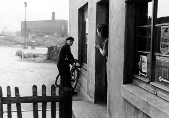 Kurz nach dem Krieg vor dem provisorischen Lebensmittelgeschäft Peter auf der Bickernstraße. Im Hintergrund Trümmer der Häuser Peter, Iburg und Zwalina.