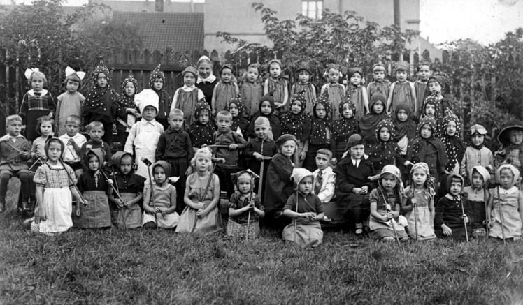 Bild unten: Kindergarten an der Bickernstraße gegenüber der Michaelkirche um 1935. Offenbar hatten sie die Kinder auf ein Märchenspiel vorbereitet.