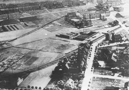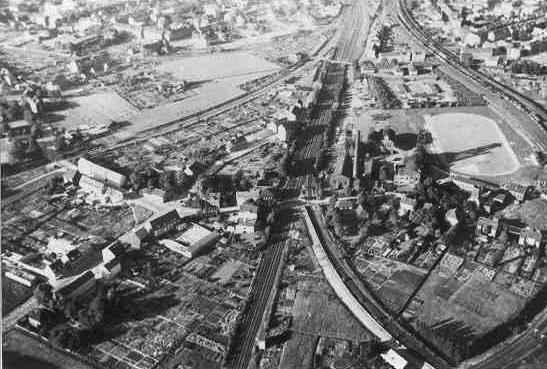 Dieses Foto zeigt die Zeche Pluto, Schacht Thies, fotografiert aus südwestlicher Richtung. Links im Bild die Gelsenkircher Straße mit ihrer 90-Grad-Kurve und der Einmündung der Plutostraße, die in der Mitte des Bildes gut erkennbar ist, wo sie die Bahnlinien kreuzt.