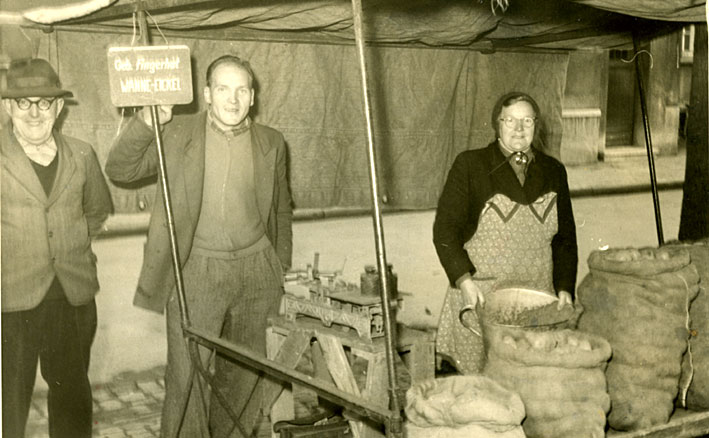 Marktstand der Gebrüder Fingerhut in den 1950er Jahren.