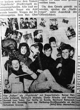 Renate Füllner meldete die Jungs an – und das Fernsehen kam wirklich. Was selten war im Wanne-Eickel der damaligen Jahre, denn wenn ein Team sich mal nach Wanne-Eickel verirrte, dann höchstens, um einen Dokumentarbeitrag über den Bergbau zu drehen. Jetzt also die TV-Abteilung „Unterhaltung“, und es wurde ernst für die Nightbirds. Ohne vernünftige Vorbereitung wurde der Tag des Rekordes angesetzt, am Samstag, 17. Dezember 1966 um 17 Uhr sollte es losgehen. Pünktlich drängelten sich Heerscharen von Wanne-Eickels Beatjüngern vor dem Falkenheim – nur einer fehlte: Nightbirds-Bassist Reinhard Ratajczak kam nicht rechtzeitig aus Süddeutschland in die Heimat. Die Party lief ohne ihn – und auch ohne viele Zuschauer. Statt die Nightbirds im Saal spielen zu lassen, fand die Rekordveranstaltung im kleinen Keller des Heims statt. Wer das Glück hatte reinzukommen, wurde bald wieder rausgeschleust, damit auch andere gucken konnten.