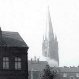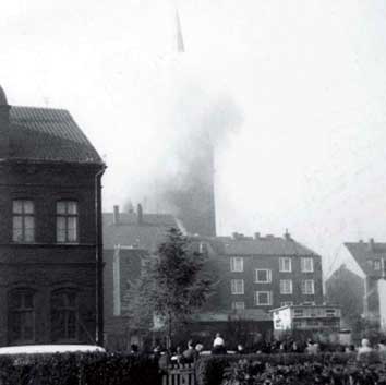 Die Barbarakirche und ihr trauriges Ende: Am 22. Oktober 1965 wird der erste Sprengsatz gezündet (Bild oben), der Turm bleibt stehen. Erst die zweite Sprengladung zwingt den Riesen in die Knie (Bild unten).