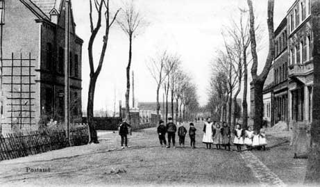 Die Dorstener StraĂe mit dem ehemaligen Postamt Holsterhausen (links im Bild) - etwa in Höhe des heutigen FirmengebĂ€udes von Bertlich. Im Hintergrund der Hof Schlenkhoff (heute GaststĂ€tte âZum Alten Fritzâ).