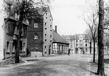 Das Foto zeigt einen Abschnitt der Dorstener Straße, etwa in Höhe der Löns Mühle. Von den Gebäuden existiert keines mehr.