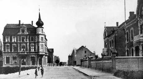 Die heutige Edmund-Weber-Straße - oben fotografiert in Richtung Osten. Das Haus links ist das Eckhaus Ed-Weber-Straße, Auf der Wilbe.