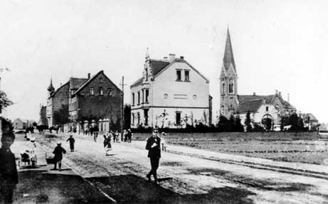 Unten fotografiert in Gegenrichtung, etwa von Höhe der Einmündung Westfalenstraße. Das helle Haus im Vordergrund ist die Post, im Hintergrund die Lutherkirche.
