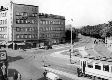 Der Glückaufplatz vor dem Zweiten Weltkrieg. Oben mit Blick Richtung Norden, in der Mitte mit Blick in die Berliner Straße und unten nur wenige Jahre später mit dem ersten Glückauf-Haus.