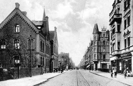 Oben: die HauptstraĆe mit dem Gemeindehaus der Christuskirche (links), das spƤter dem Kaufhaus Hertie weichen musste.
