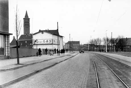 Blick von den Stadtwerken über die Hauptstraße nach Norden. Links der Turm der Zwölf-Apostel-Kirche.