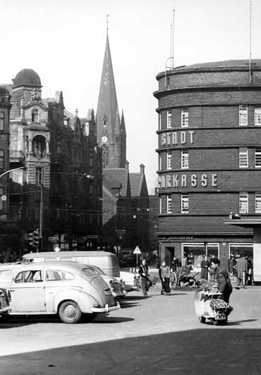 Darunter: Blick aus der Peckelsen-Passage auf den Buschmannshof und die Wiese - später der zentrale Treffpunkt der Wanne-Eickeler Gymnasiasten.