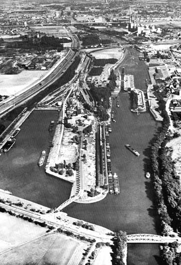 Wanne-Eickeler Häfen auf einen Blick. Das Hafenbecken links ist mittlerweile verfüllt.im Vordergrund: die alte Brücke der Recklinghauser Straße.